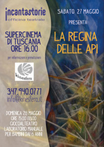 Dopo il successo di “Fratellino e sorellina” a dicembre 2016, la compagnia Incantastorie-Officina Teatrale torna al Supercinema di Tuscania e inaugura la stagione con la nuova fiaba “La regina delle api”, SABATO 27 maggio, alle ore 16:00.